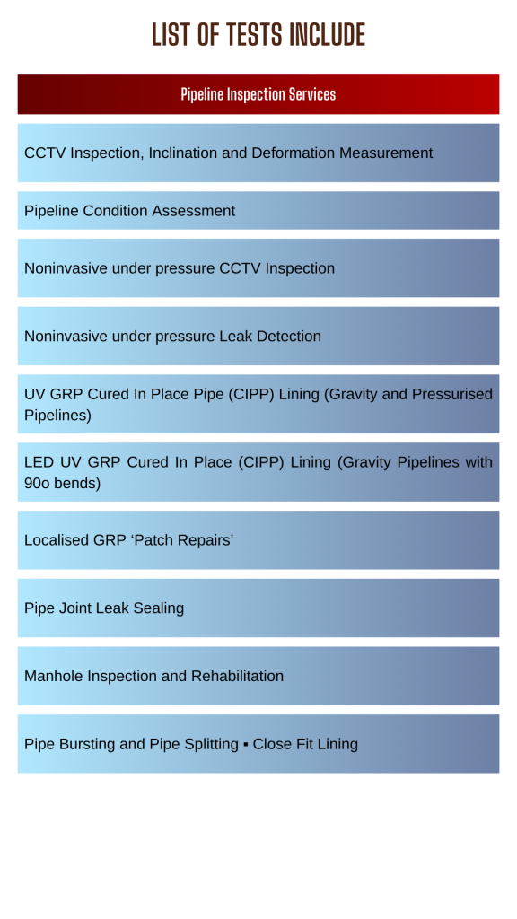 Our laboratory tests cover a wide range of Pipeline inspection services ensure the integrity, safety, and efficiency of pipelines used for transporting oil, gas, water, and other fluids. These inspections help detect defects, corrosion, leaks, and structural weaknesses, preventing failures and ensuring compliance with industry standards.